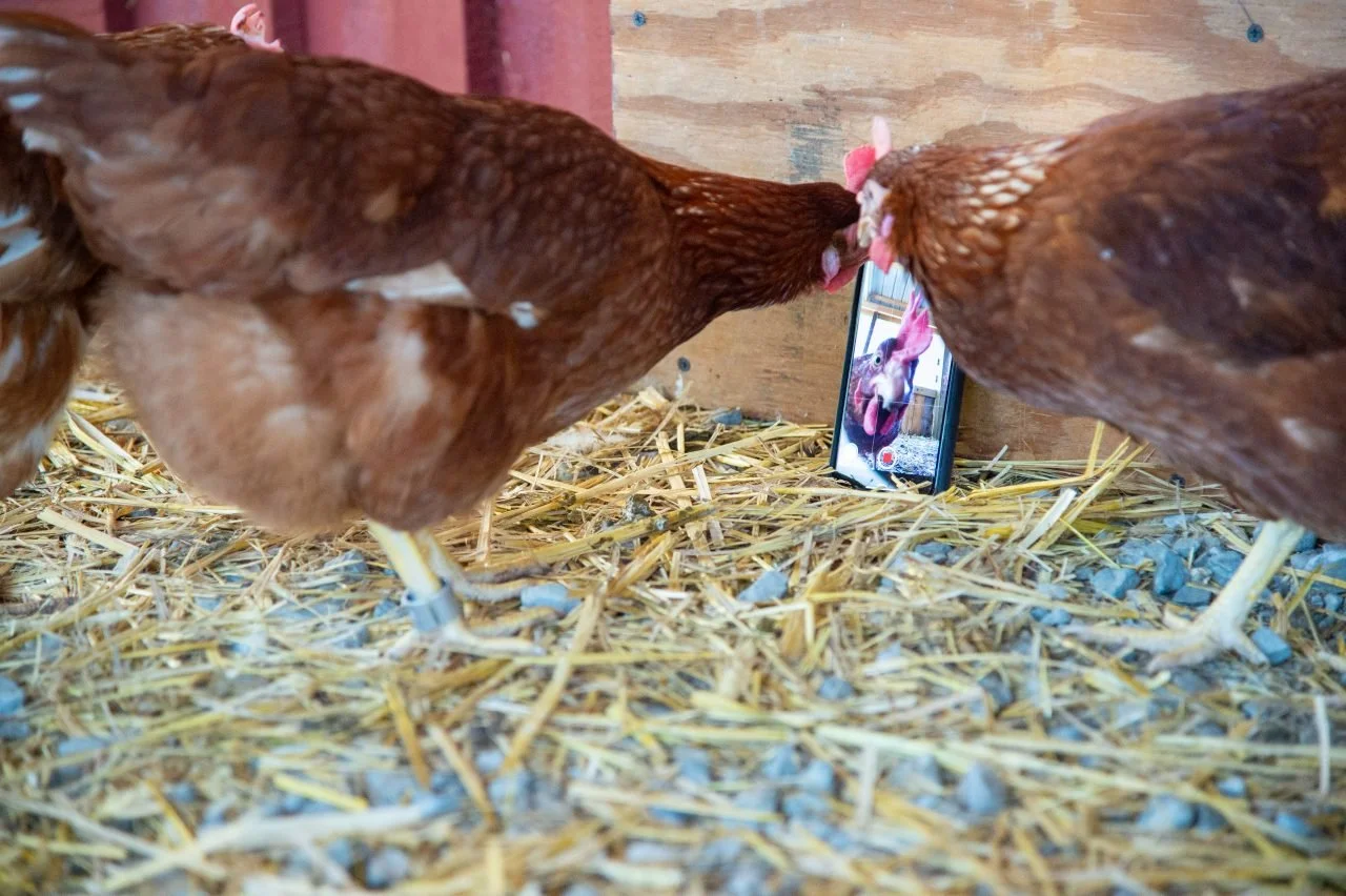 Gallinas probando el modo “selfie’ - Farm Sanctuary https://www.farmsanctuary.org/news-stories/celebrating-chickens-farm-sanctuary/