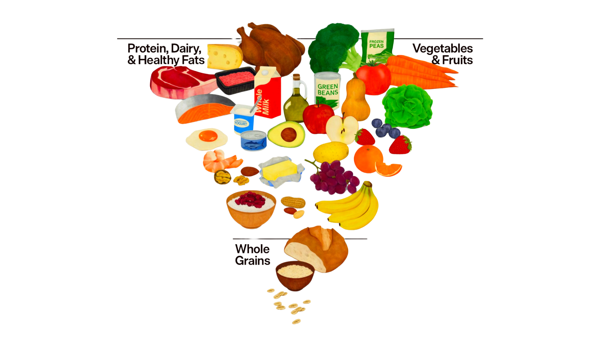 Esta gráfica promueve el consumo de proteína animal y lácteos enteros en cada comida, presentándolo como una forma de “terminar la guerra contra la proteína”. Ese mensaje no está respaldado por décadas de evidencia científica en nutrición.